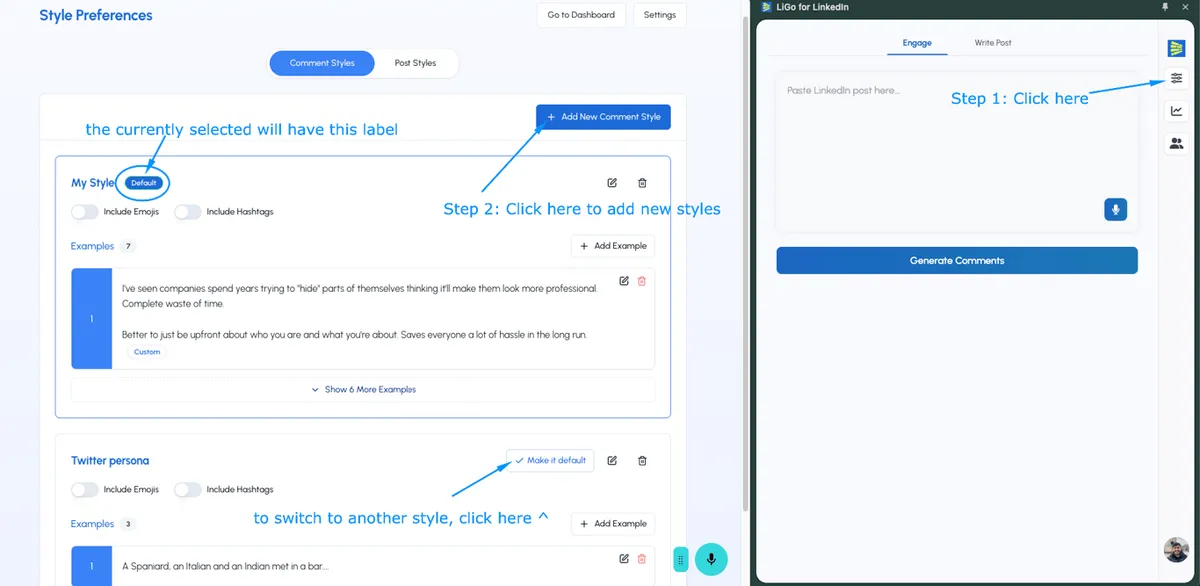 • Use case: Create a separate comments theme for LinkedIn, Reddit, X & Facebook (that matches your style for each of these platforms).